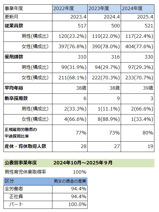 新卒で入社してから結婚、2回の産休・育休を取得して勤務しています。産休・育休の取得しやすい社風で、復帰時も勤務方法について相談できました。様々な世代のスタッフがいるので、休みをカバーしやすく、子供の病気や行事での休暇も取りやすいです。サン薬局は勤務可能な地域に複数の店舗があり、ライフステージに応じて勤務形態が選択できるので、女性が長く働くことができる職場だと思います。