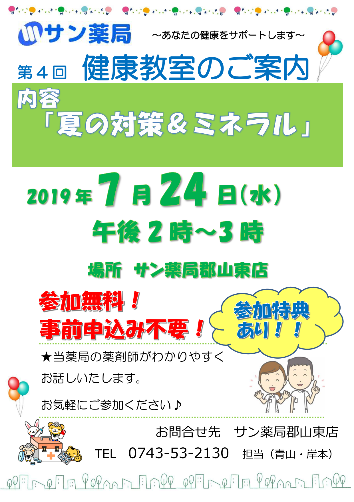 2019年7月10日 郡山東店 第4回健康教室のご案内 サン薬局 郡山東店にて 第4回健康教室を開催いたします。 7月24日(水) 午後2時~3時 テーマ「夏の対策&ミネラル」 参加費無料・事前申し込み不要 場所 サン薬局郡山東店(近鉄ハーベス大和郡山店 2F) 是非ご参加ください