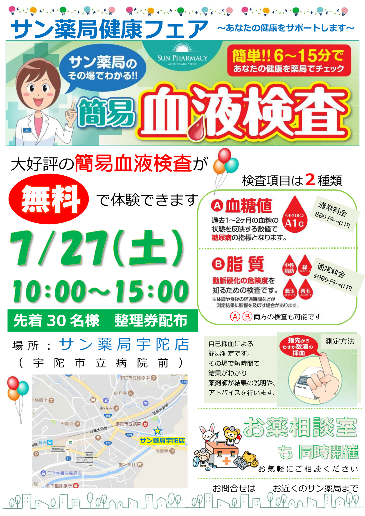 2019年7月17日 サン薬局宇陀店 ★健康フェア★を開催します サン薬局宇陀店で 今年も健康フェアを開催いたします 日時:2019年7月27日(土)10:00 ~ 15:00 場所:サン薬局宇陀店 自己採血による簡易測定で、血糖値や脂質を確認することができる 「簡易血液検査」の無料体験(先着30名様)や お薬の相談室を 行います 是非 ご参加ください