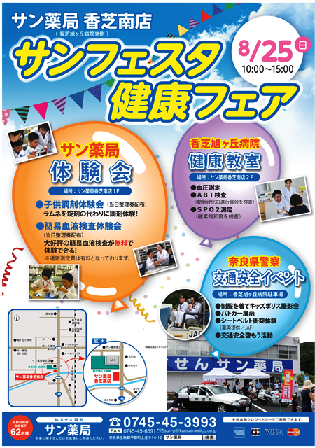 2019年8月19日 香芝南店 サンフェスタを開催します 2019年6月に香芝旭ヶ丘病院前、168号線沿いにオープンしました サン薬局香芝南店 でサンフェスタを開催いたします。 子ども調剤体験や健康教室などイベントが盛りだくさん! 日時:2019年8月25日(日)10:00 ~ 15:00 場所:サン薬局香芝南店 (香芝旭ヶ丘病院東側 168号線 GEO隣) 是非 ご参加ください