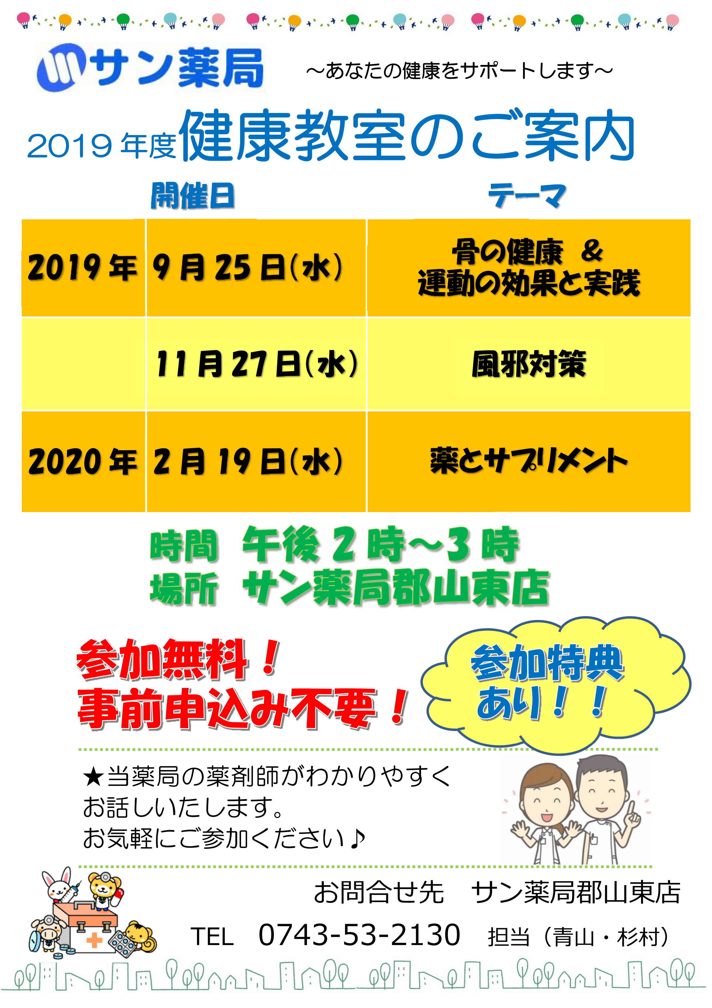 2019年9月9日 郡山東店◆健康教室 年間スケジュール◆ サン薬局 郡山東店では、2ヶ月に1度「健康教室」を開催しています テーマに合わせて健康について考えて頂けるような内容を スタッフで企画して店舗内で開催しています。 回を重ねるごとに参加者も増え、質問やリクエストも頂き活発に開催しています。 次回を楽しみにしていますとのお声も頂き、2019年度の年間スケジュールを作成いたしました 皆様のご参加をお待ちしております