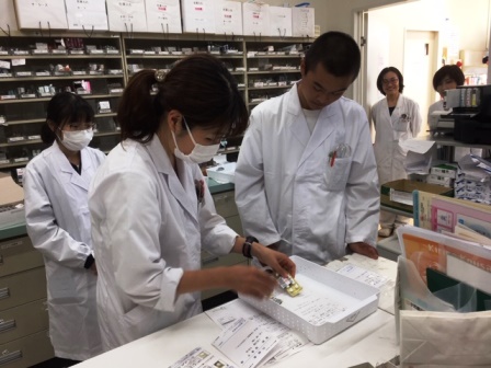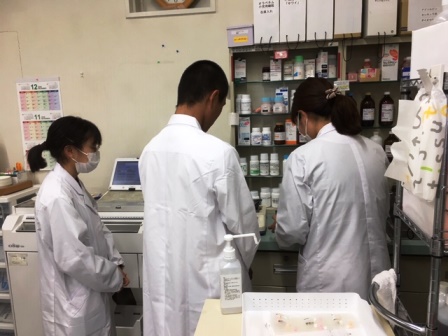 初日は処方箋の受取りや新患アンケートなど来局された患者さんへの対応を体験してもらったり、ラムネ菓子等を用いて調剤業務の体験をしてもらいました。